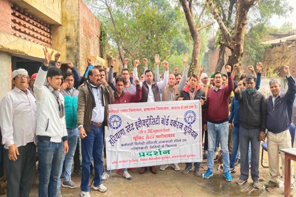 Faridabad- ऑनलाइन तबादला पोलिसी के विरोध में बिजली कर्मचारियों का प्रदर्शन लगातार तीसरे दिन भी विरोध के चलते ग्रेटर फरीदाबाद की सबडिवीजन छांयसा पर हरियाणा कर्मचारी महासंघ से संबंधित एचएसईबी वर्कर्स यूनियन के बैनरतले प्रधान सुनील कुमार के नेतृत्व में हुआ । विरोध प्रदर्शन के दौरान कर्मचारी निगम मैनेजमेन्ट व सरकार के खिलाफ खूब जमकर गरजे और नारेबाजी की । कर्मचारियों के इस धरने में मौजूद सर्कल सचिव सन्तराम लाम्बा ने बताया कि बिजली निगम आज कर्मचारियों की भारी कमी से जूझ रहा है । जबकि बिजली निगम में समानतानुसार पक्की भर्ती करने की बजाय सरकार व मैनेजमेन्ट दवारा कर्मचारियों का शोषण किया जा रहा है ।